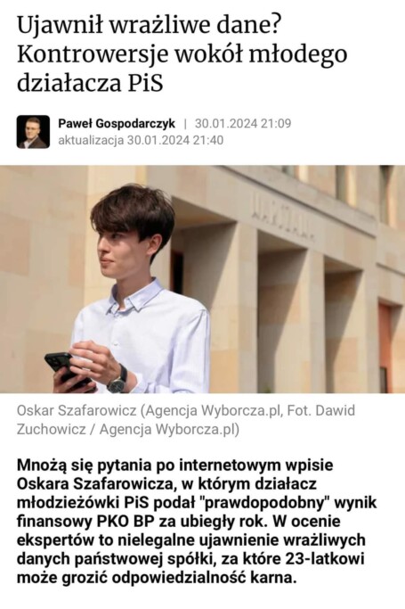 Tak, cudowni dziennikarze obozu lewicowo-liberalnego, Oskar Szafarowicz, młody polityk PiS (partii opozycyjnej dziś) trzęsie rodzimą bankowością i rozdaje karty na giełdzie. Tyle że nie w samej Warszawie. Wieczorem podbiłem już Wall Street.