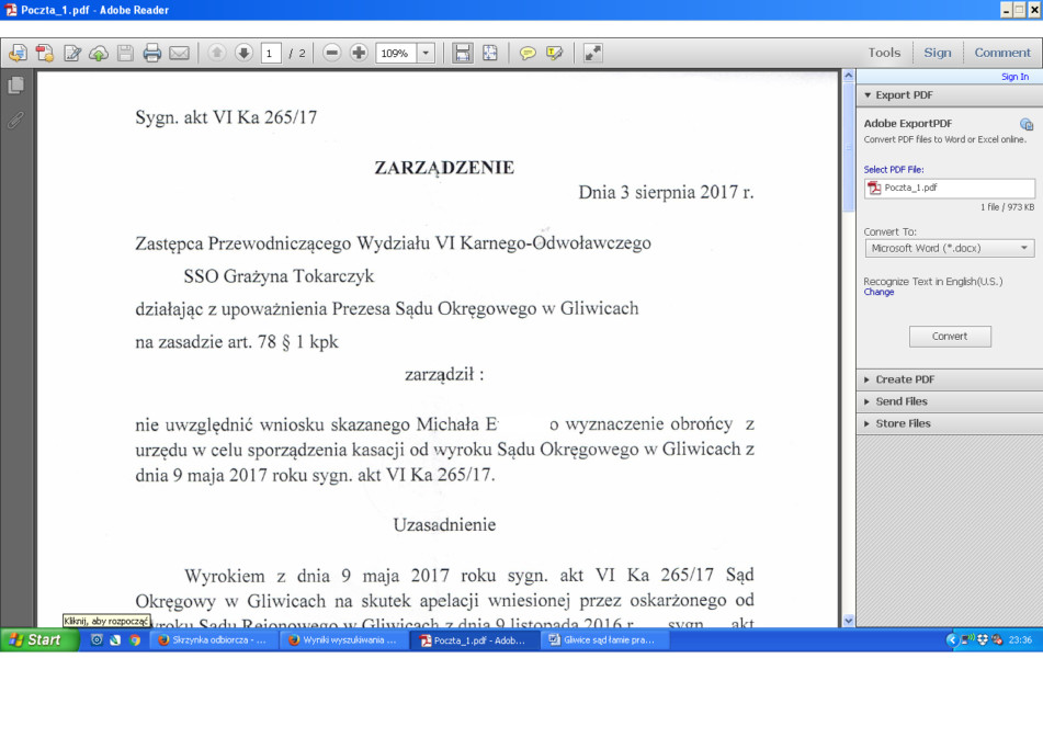 Oczywiście wyrok Sądu Okręgowego przypieczętował pierwszoinstancyjny. Michał, nie mogąc pozbyć się nieznośnego uczucia okradzenia przez byłego wspólnika ojca i pokrzywdzenia dokonanego przez sąd postanowił złożyć kasację. Cóż z tego, skoro adwokaci, do których się zwracał, wymawiali się brakiem czasu etc. Złożył więc wniosek do Sądu Okręgowego w Gliwicach o przyznanie adwokata z urzędu.