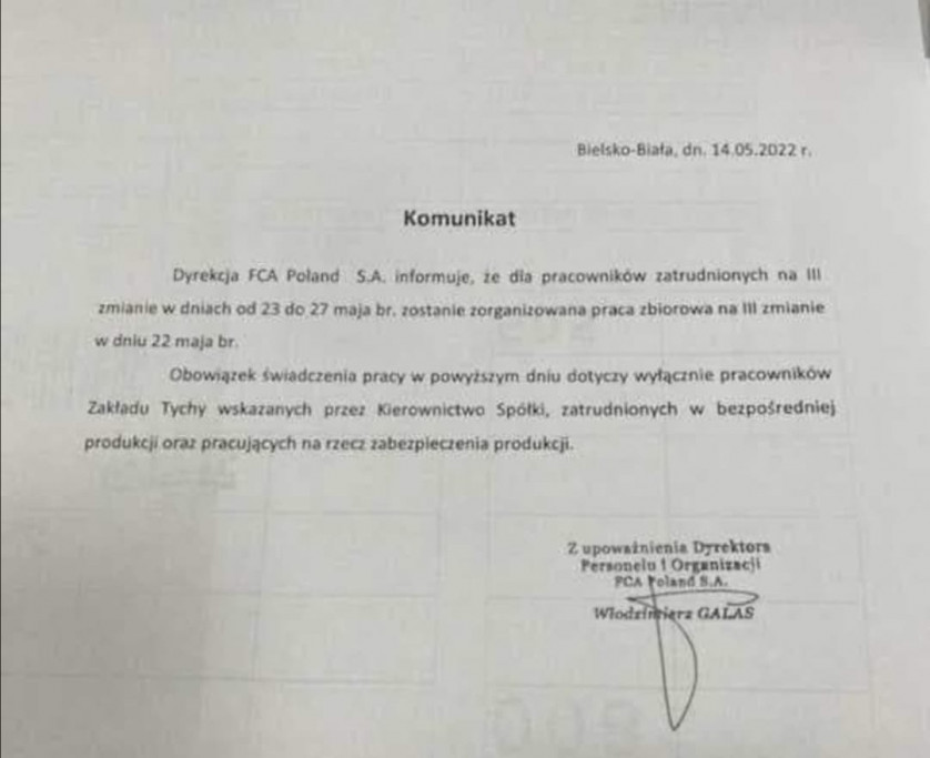 Dyrekcja FCA Poland komunikat ws pracy w niedzielę 22 maja 2022 roku