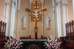 Na ołtarzu znajduje się wizerunek alfy i omegi – pierwsza i ostatnia litera alfabetu greckiego, personifikująca początek i koniec, nawiązująca do tekstu z Apokalipsy Jana: „Jestem Alfą i Omegą, początek i koniec, mówi Pan” (Ap 1, 8). Na prawo od ołtarza znajduje się ambona wyłożona ciemnozielonym marmurem. Na kolumnach po obu stronach ołtarza znajdują się dwie ikony świętych apostołów – Piotra i Andrzeja Pierwszego Powołanego. W tylnej części prezbiterium znajduje się kolejna trzystopniowa elewacja, przylegająca do ściany absydy świątyni – obejścia. W tej części znajduje się katedra arcybiskupa oraz miejsca dla duchowieństwa. Prezbiterium katedry oddzielone jest rzeźbionymi drewnianymi przegrodami od kaplicy Miłosierdzia Bożego z ołtarzem Świętych Darów oraz od progu zakrystii. Pośrodku, na ścianie absydy, znajduje się krucyfiks, którego wysokość wynosi dziewięć metrów, a postać Chrystusa na krzyżu ma trzy metry. Po obu stronach krucyfiksu znajdują się dwie gipsowe figury – Matki Boskiej i Ewangelisty Jana. Wykonał je rzeźbiarz S. F. Zaklebin.
