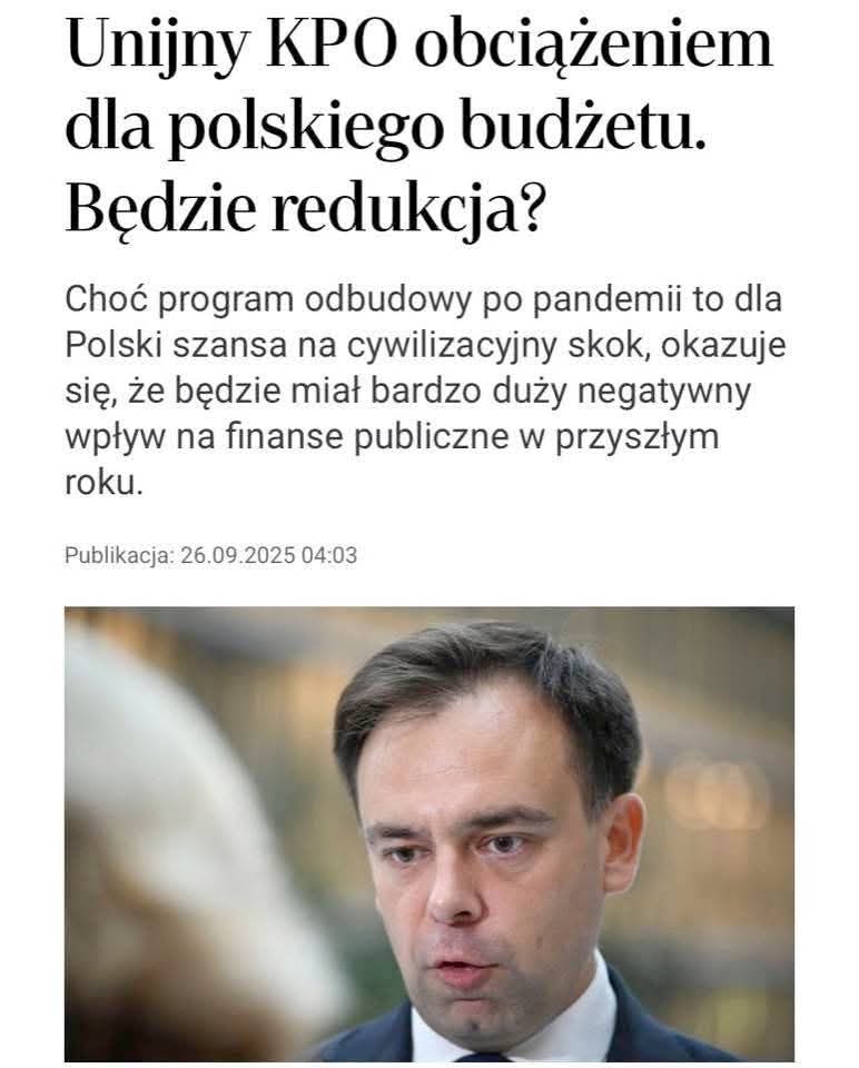 Pieniądze z KPO to wyjątkowe OSZUSTWO. Po pierwsze większość tych pieniędzy to POŻYCZKA. Pożyczka obwarowana warunkami które są BARDZO KOSZTOWNE. Pożyczka którą dostaje się dopiero kiedy WYDA SIĘ WŁASNE PIENIĄDZE, a ten wydatek zostanie uznany za przez UE za „spełniający warunki”. Dodam że pożyczkę której jeszcze nie dostaliśmy zaczęliśmy SPŁACAĆ, bo takie były warunki otrzymania pieniędzy z KPO.