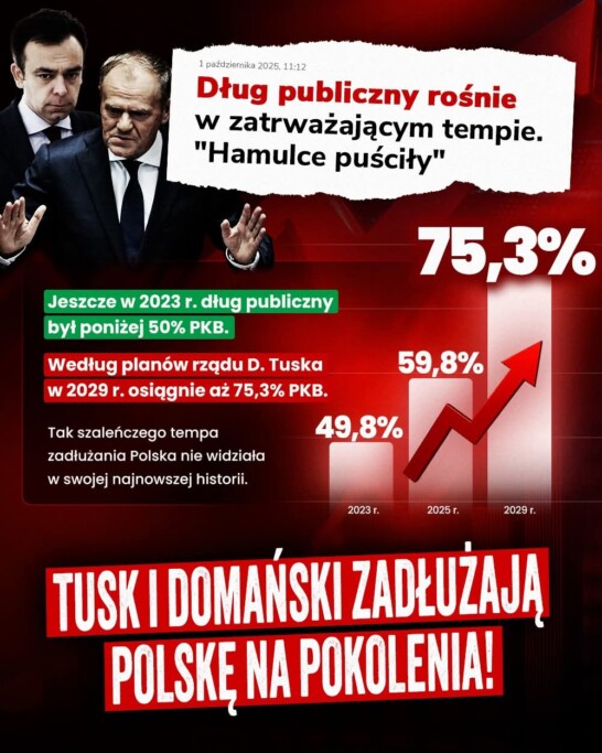 Warto przypomnieć, że tak szaleńczego tempa zadłużania się Polska w swojej najnowszej historii jeszcze nie widziała. Przypominam, że jeszcze w 2023 r. dług wynosił poniżej 50% PKB. Obecna ekipa w zaledwie kilka lat planuje podnieść to obciążenie o połowę, do 75%.