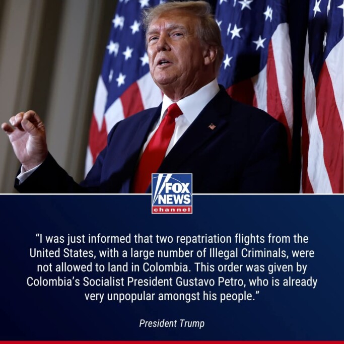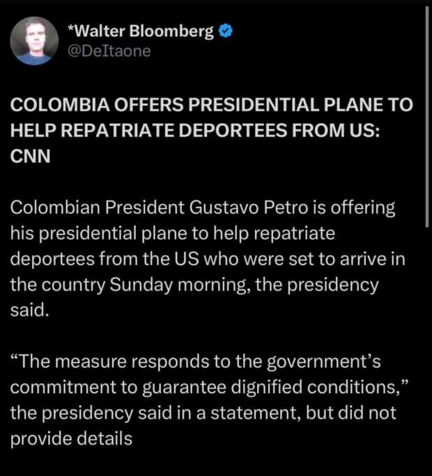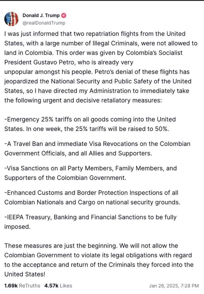 Trump sieknął cłami na towary z Kolumbii, zakazem wjazdowym dla elity z Kolumbii, włącznie z rządową i sympatykami oraz sojusznikami Kolumbii, dodatkowymi inspekcjami wszystkiego ci pochodzi z Kolumbii…