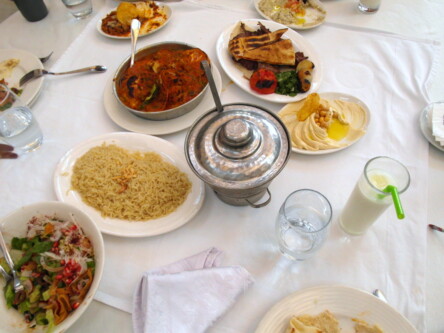 Trudno opisać wszystko co zostało nam przyniesione na stół. Było pyszne, ciekawe i inne niż to do czego jestem przyzwyczajony. Nazwy tym bardziej abstrakcyjne. Chlebek (chyba pita) to jakby dwie skórki z pustym środkiem, jeszcze ciepły. Zupa o smaku grochówki, ale chyba z soczewicy. Należało ją skropić obficie tuż przed jedzeniem sokiem z cytryny i to jest mistrzostwo w podbiciu nudnego smaku grochówki. Do tego jeszcze trzeba było wsypać coś jak czipsy ziemniaczane. Potem pasty a’la humus, a nawet lepsze. Ryż, sałatki, jakiś gulasz i pełno zapiekanych drobiazgów niby pierożki i jogurt naturalny. W gastronomicznych tematach jestem laikiem. Na koniec owoce i masa ciekawych ręcznie wykonanych słodyczy.