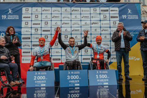19. Cracovia Maraton dla Zawodników Niepełnosprawnych na Wózkach wygrał Rafał Wilk (Sport Jest Jeden – Rzeszów) (czas 1:13:09). Triumfator zwyciężył już ósmy raz w historii rywalizacji w Krakowie. Drugi był Krzysztof Plewa (Veloaktiv Kraków) (1:14:28) a ostatnie miejsce na podium zajął Rafał Szumiec (1:15:09). Tuż poza podium znalazł się Słowak Milos Hudec (Handbike Liptov) (1:16:20). Różnice czasowe pomiędzy pierwszym a czterema zawodnikami wyniosły 4. sekundy! Na piątej pozycji linię mety przekroczył Sławomir Gorzkowicz, który podobnie jak drugi Krzysztof Plewa reprezentował Veloaktiv Kraków.