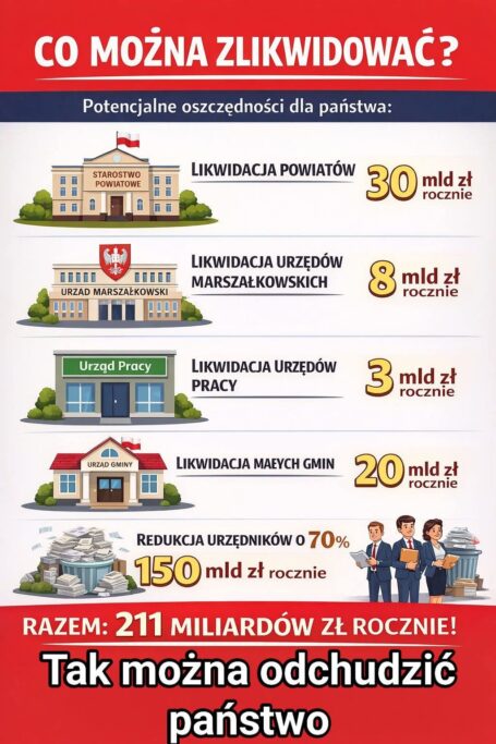 Gdy zsumujemy wszystkie te elementy – likwidację powiatów, likwidację urzędów marszałkowskich, likwidację urzędów pracy, redukcję liczby urzędników oraz połączenie małych gmin – okazuje się, że potencjalne oszczędności dla państwa mogłyby wynosić nawet 211 miliardów złotych rocznie. To kwota, która pokazuje skalę problemu i jednocześnie ogromny potencjał reformy państwa.