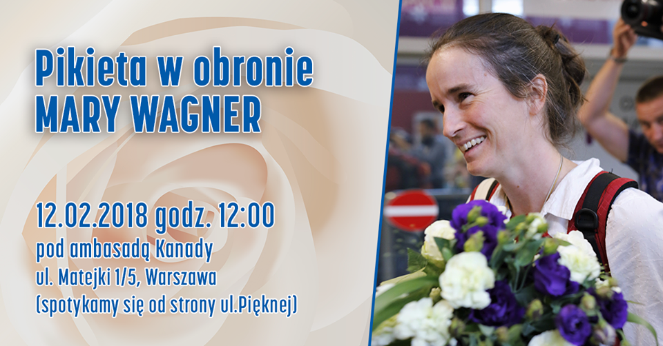 Warto także przyjść na protest w obronie Mary Wagner, który odbędzie się w poniedziałek 12 lutego 2018 r. pod Ambasadą Kanady w Warszawie. Placówka dyplomatyczna kraju, który zamiast liścia klonu powinien umieścić na swojej fladze feminazistowską swastykę znajduje się pod adresem „ul. Matejki 1/5, 00-481 Warszawa”. Osoby, które chcą wziąć udział w pikiecie proszone są o gromadzenie się od strony ul. Pięknej. Zaczyna się ona o godz. 12.00. Wydarzenie związane jest z 44. urodzinami Mary Wagner.