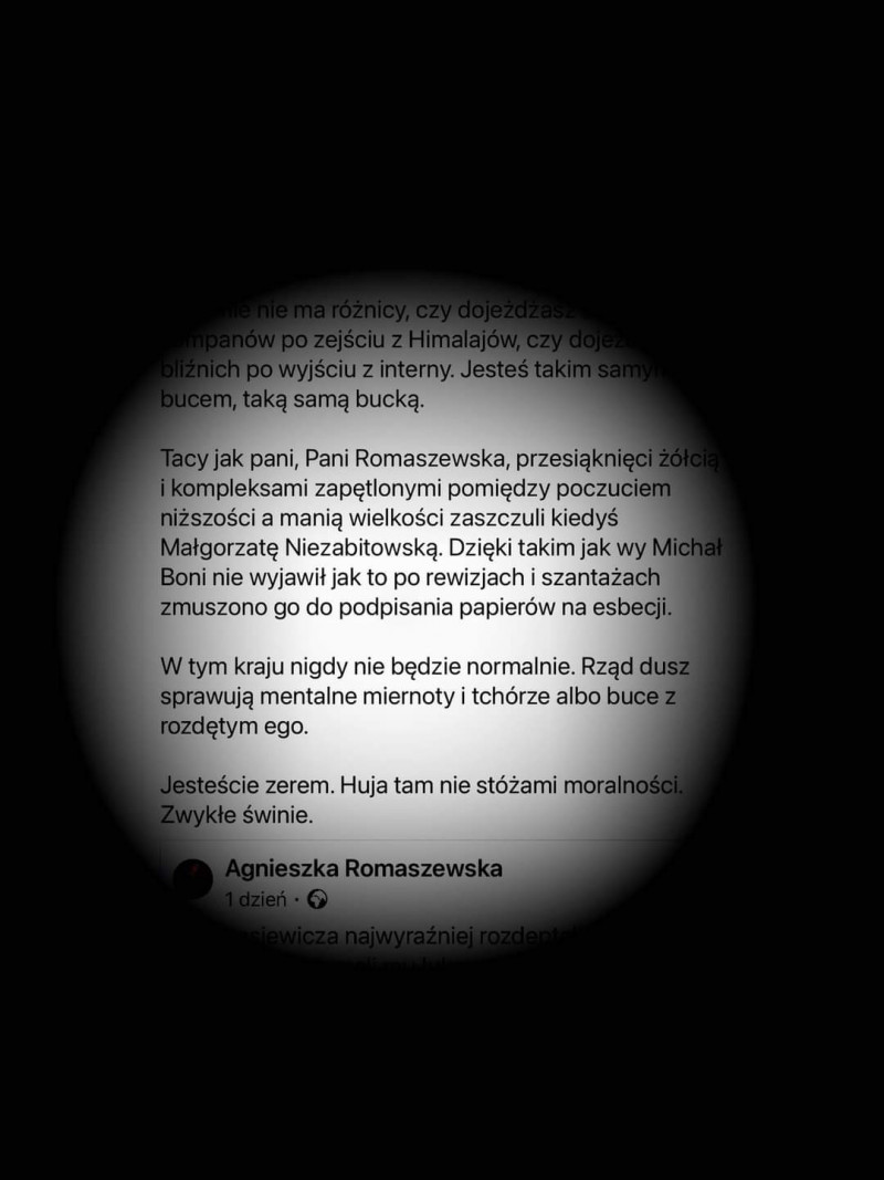 Zestaw epitetów, który zaserwował podając dalej mój post, był naprawdę imponujący: zaliczył mnie najpierw do bufonów z rozdętym ego, następnie zastosował feminatyw „bucka”, skonstatował, że jestem przesiąknięta żółcią i kompleksami, zawieszona pomiędzy manią wielkości a kompleksem niższości, oskarżył mnie następnie o zaszczucie Michała Boniego i Małgorzaty Niezabitowskiej (chodzi o ten przykry fakt, że oboje byli TW, choć akurat ja, na temat żadnego z nich, nigdy się jakoś obszerniej nie wypowiadałam). Zakończył zaś efektowną inwokacją skierowaną do mnie i zapewne kogoś jeszcze, bo przez „wy”: