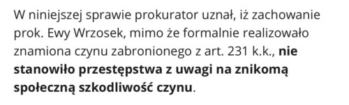 Prokurator stwierdza wprost, że zachowanie Ewa Wrzosek wypełnia znamiona czynu zabronionego z art. 231 k.k., czyli nadużycia władzy przez funkcjonariusza publicznego. A więc: było bezprawie, była władza, było jej przekroczenie. I na tym, w normalnym państwie prawa, sprawa powinna się dopiero zaczynać.