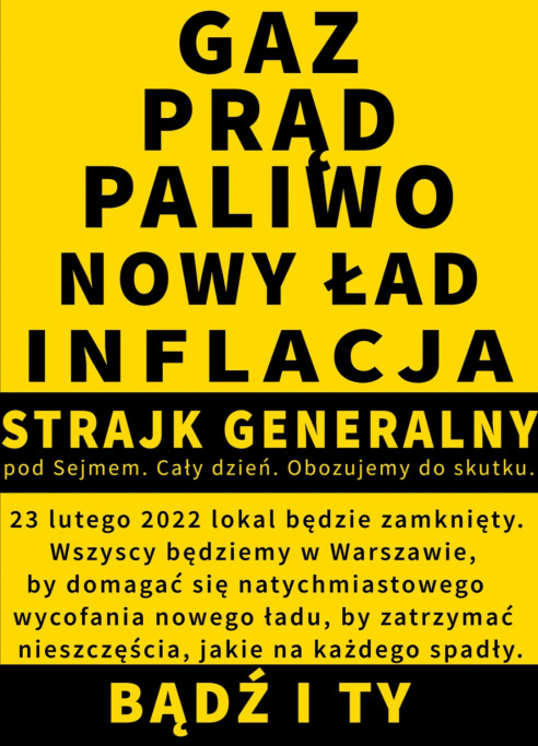 Spotykamy się 23 lutego przed sejmem i ogłaszamy STRAJK GENERALNY – NO LOGO – to ma być nasz obywatelski sprzeciw a nie WIEC PARTYJNYCH. Jeśli chcesz zaprotestować to MUSISZ TAM BYĆ z nami. Będzie to PROTEST WSZYSTKICH OBYWATELI PRZECIWKO DROŻYŹNIE. Ta akcja to SZANSA DLA CAŁEJ OPOZYCJI. WSZYSCY POLACY ZJEDNOCZENI!!!