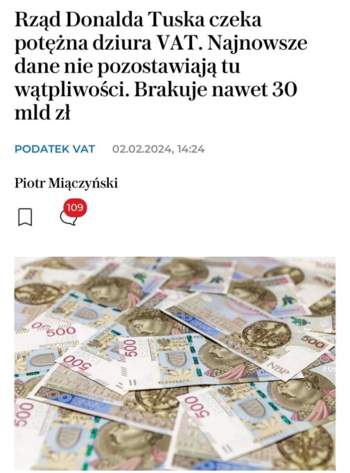 Eksperci od gospodarki i finansów szacują (przyjmuję prognozy najbardziej życzliwych wobec rządu analityków), że „dziura Domańskiego”, czyli różnica między szacowanymi w projekcie budżetu a realnie osiągniętymi wpływami z VAT sięgnie w tym roku go najmniej 35 miliardów złotych.