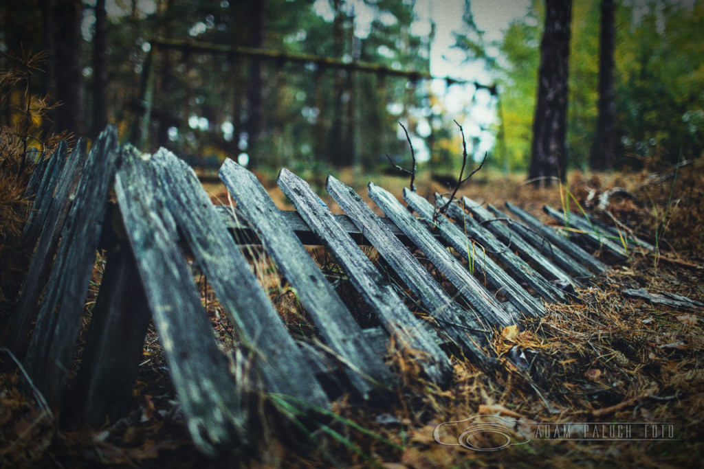 Jest tak ogromna że jedyna rzecz jaką znam i z jaką mogę ją porównać to wieża Eiffela…Dookoła pełno trójkątnych tabliczek ostrzegających o skażeniu ,wciągam aparat kadruję na tabliczce z symbolem atomu ale gałąź akcji zasłania mi widok , nie zdejmując oka z wizjera próbuje ja ułamać …Zamiast gałęzi ułamuje się wielki kolec który zostaje w moim kciuku…Nigdy takiego dużego nie widziałem , próbuję go wyciągnąć wyciskam trochę krwi ale jest ułamany, nic nie wystaje jest wbity niemalże pionowo…Ten kolec akacji zostanie zemną aż do powrotu do polski a mówili żeby nie zabierać pamiątek …Trochę spanikowany tłumaczę sobie że przecież kolec rósł wysoko że nie było go wtedy kiedy opadła radioaktywna chmura i że to tylko duża drzazga…Dopiero w Polsce dowiem się że największe skażenie jest w wierzchniej warstwie gleby z której to rośliny budują swoje tkanki…Kolejne miejsce ośrodek wypoczynkowy „Szmaragdowy” …Piękny sosnowy las a w nim pełno domków ze ścianami pokrytymi rysunkami z radzieckich bajek …To tu pracownicy elektrowni odpoczywali wraz z rodzinami po ciężkim tygodniu pracy…Na placu zabaw dla dzieciaków walący się płotek