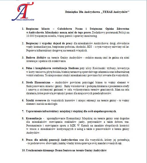 Zapraszam Was wszystkich do współpracy, a także do czynnego udziału w wyborach samorządowych. Jestem przekonany, że nasze działania odniosą pożądany skutek dla dobra Miasta i Gminy Andrychów.
